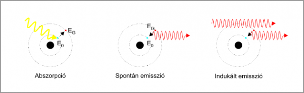 ahol h a Planck állandó, f a foton frekvenciája, – A a közegre jellemző erősítési tényező, L pedig a bejárt út figyelembe véve a tükrök közötti ide-oda verődést is.