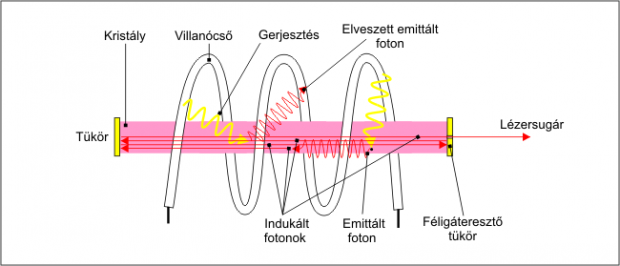 A spontán emisszió útján keletkezett fotonok közül azok, amelyeknek a terjedési iránya a kristály két végére szerelt tükrökre merőleges, a kristály hosszában ide-oda verődve lavinahatást idéznek elő, hiszen a villanócső által gerjesztett atomokat indukált emisszió útján legerjesztve még több és több fotont hoznak létre, melyek újabb és újabb indukált emissziót váltanak ki.