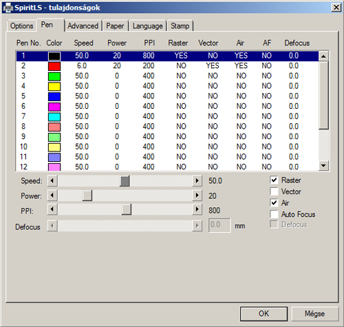 A Pen lapon 16 színhez lehet Speed (sebesség), Power (erő), PPI (inchenkénti impulzusok száma), Air (légbefúvás), Autofocus (autofókusz), és Defocus (kiemelés a fókuszból) értékeket rendelni. A rajzoló programban is pont ugyanezekkel a színekkel kell rajzolni.